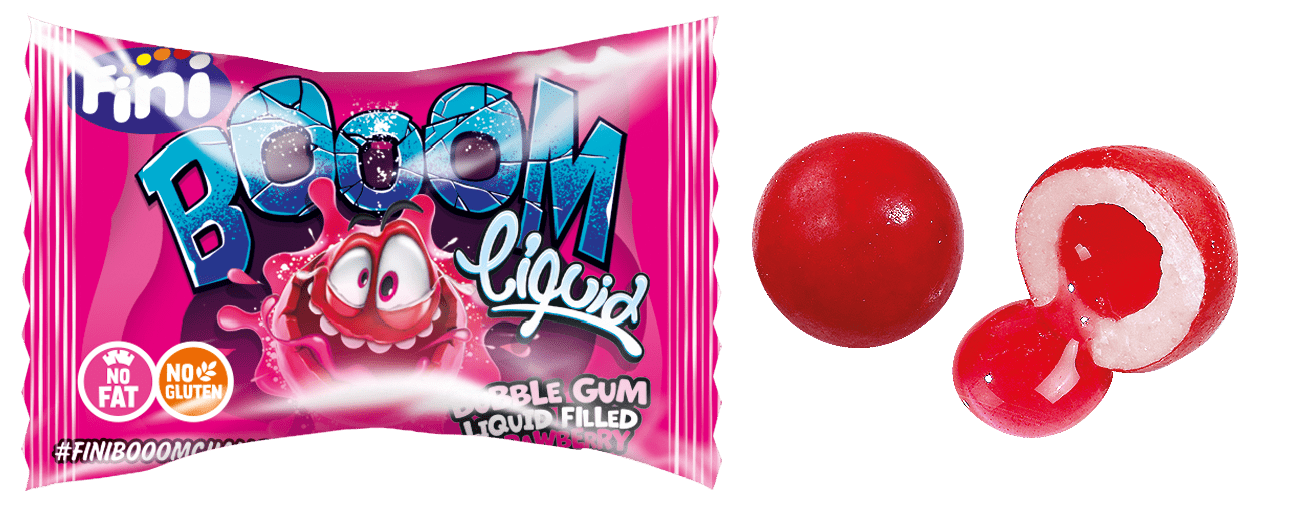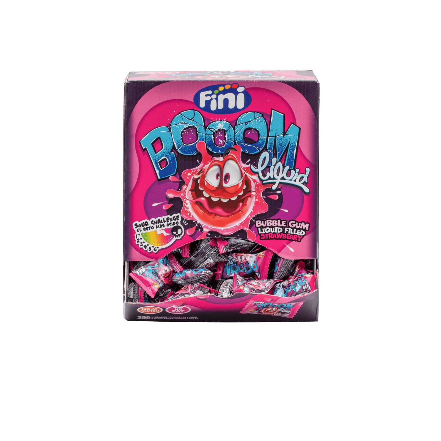 Estuche con 200 chicles Fini Booom envueltos individualmente, rellenos de líquido súper ácido con sabor a frambuesa. Perfectos para quioscos, panaderías, fiestas y candy bar.