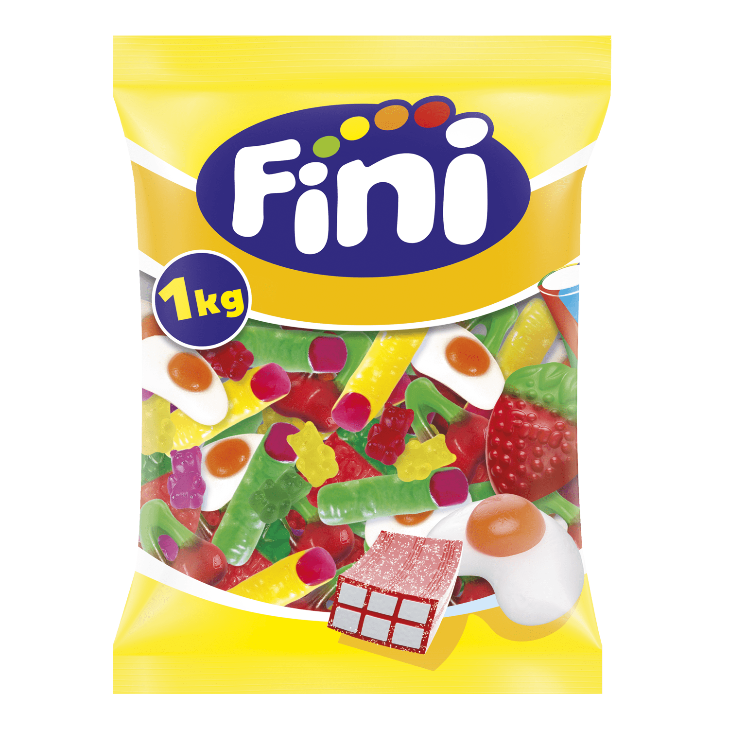 Bolsa de 1 kilo de Cinema Mix Fini, con una selección de las golosinas de brillo más icónicas de Fini, con dedos, huevos fritos, fresas salvajes, ositos y cerezas. Ideal para fiestas, meriendas, candy bar o tardes de peli y manta con tus chuches favoritas.