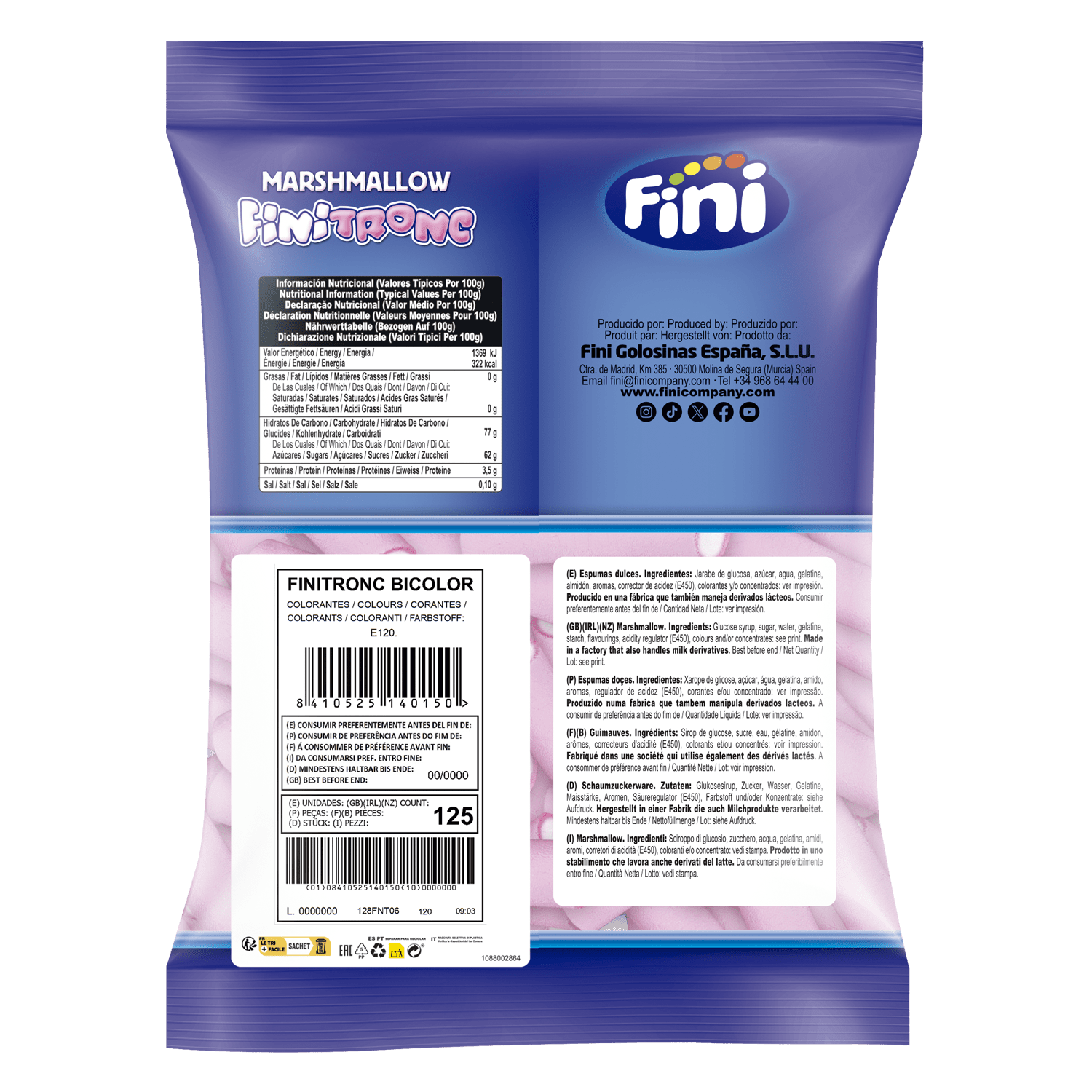 Bolsa con 125 unidades de Finitronc Bicolor Fini, nubes de color rosa con sabor un sabor suave a fresa-nata y textura esponjosa. Perfectas para decorar, tartas de chuches, candy bar o para darle un toque rosa a cualquier evento.