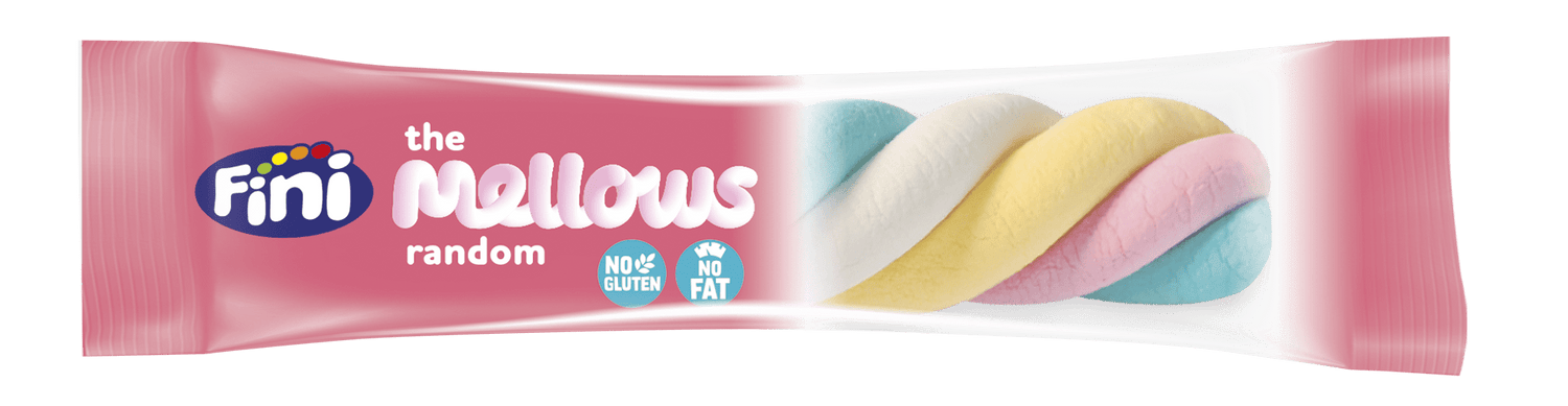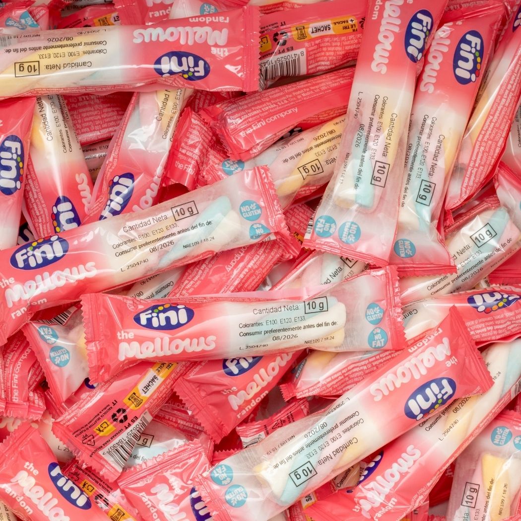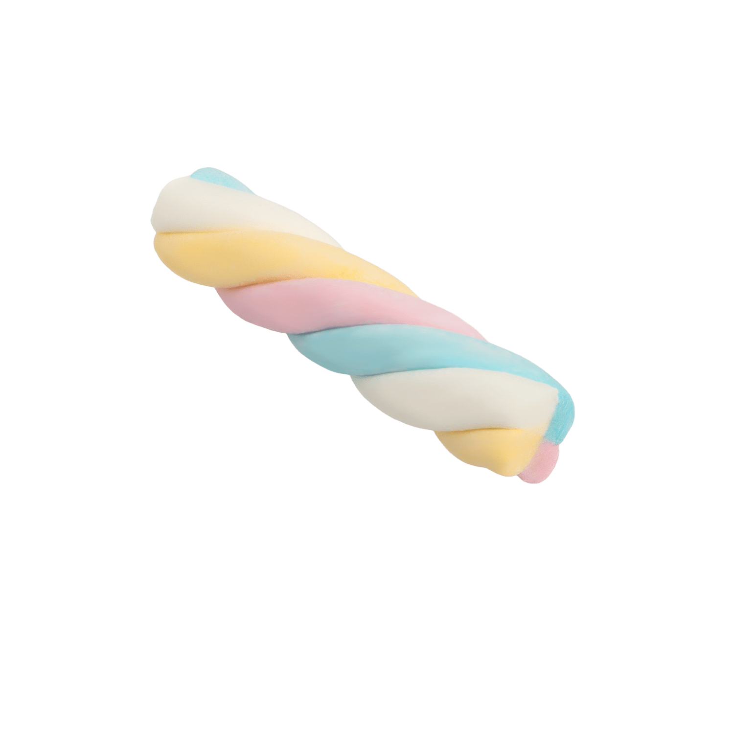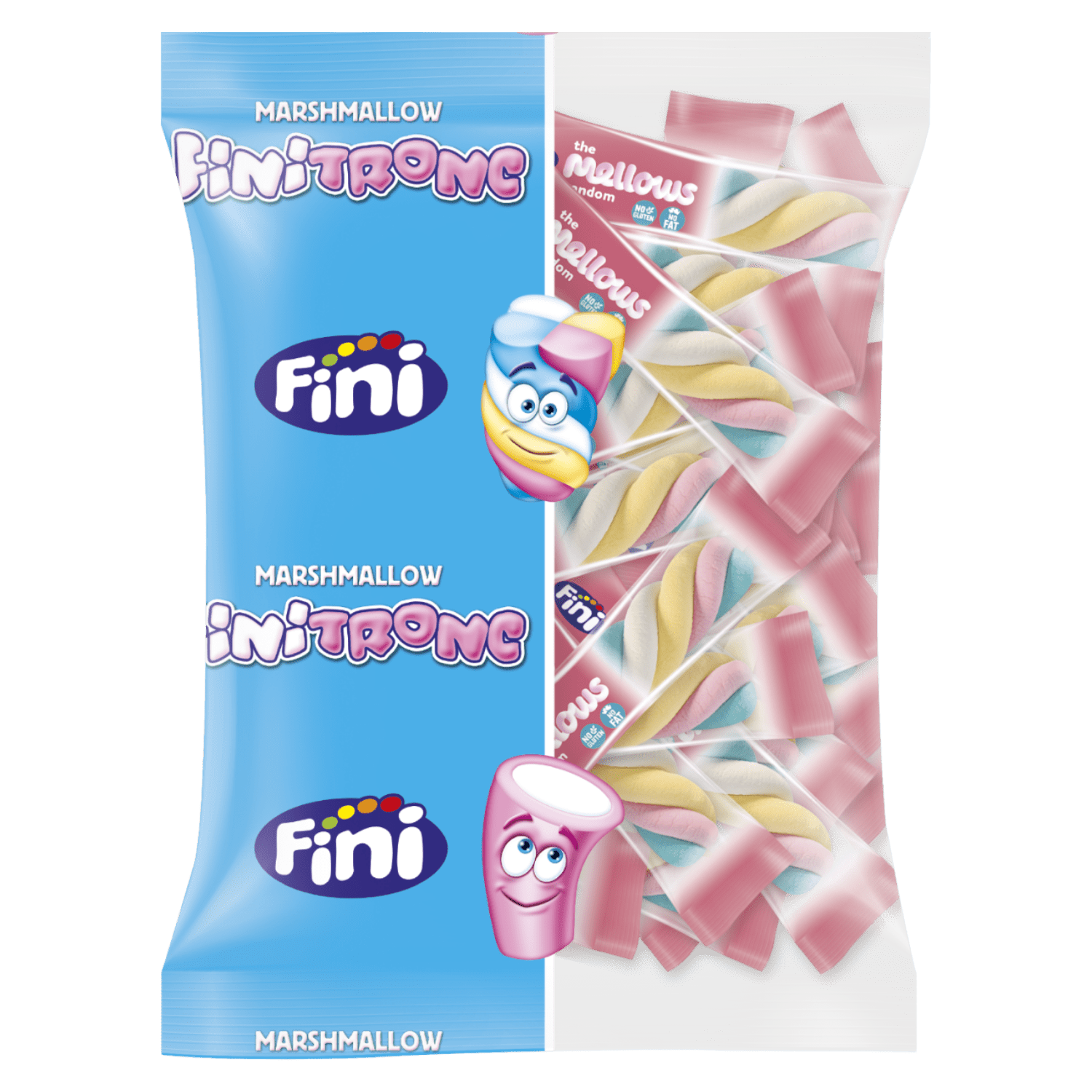 Bolsa con 70 unidades envueltas individualmente de nubes Finitronc Twisty Fini. Marshmallows trenzados en tonos pastel (rosa, amarillo, blanco y azul). Perfectas para candy bar, detalles de cumpleaños o tartas de chuches.