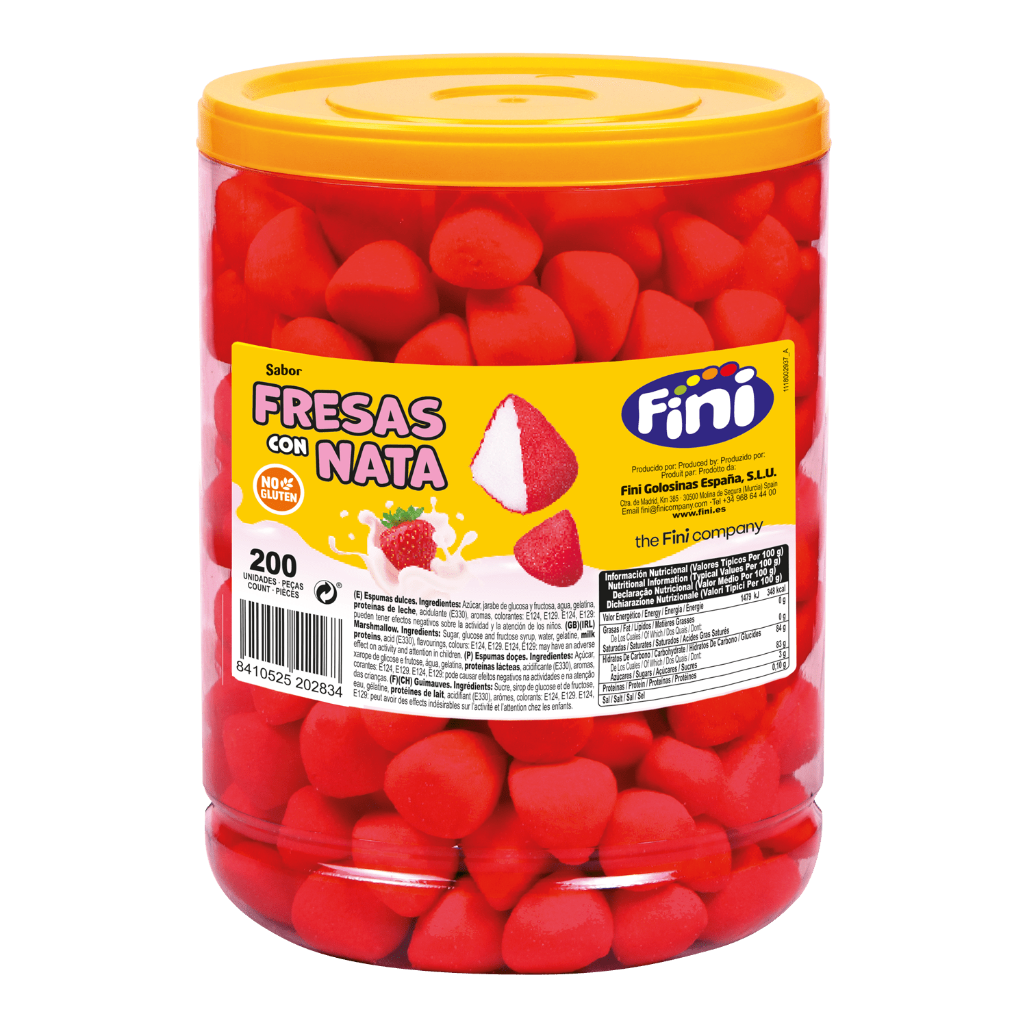 Tarro con 200 unidades de nubes Fresas con Nata Fini con sabor a fresa y relleno cremoso de nata. Perfectas para cumpleaños, baby shower y decoración en candy bar.