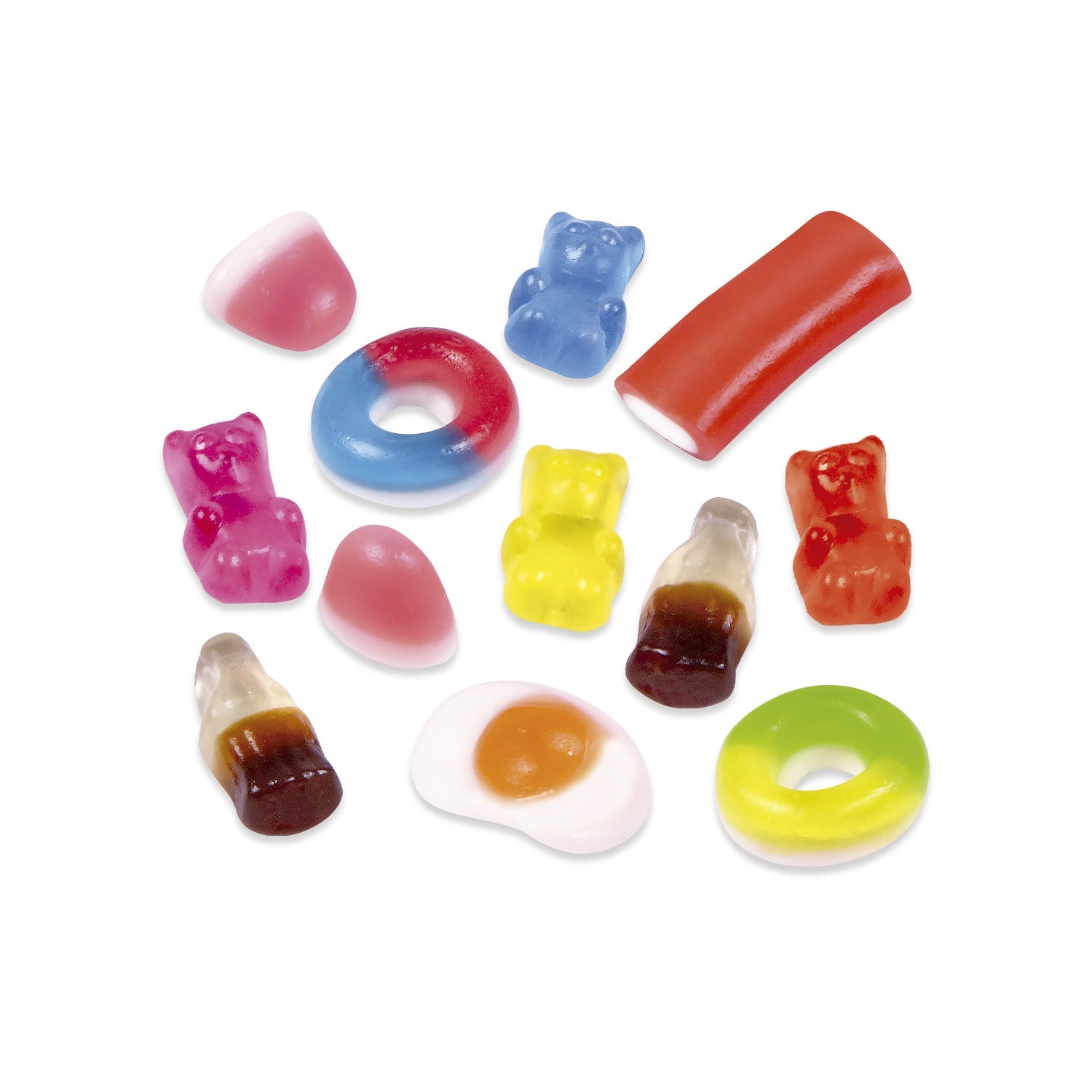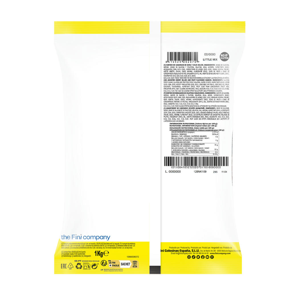 Bolsa de 1 kilo de Little Mix Fini, un mix de golosinas brillo que incluye besos, aros, ositos, botellas de cola pica, regalices rellenos y huevos fritos. Perfecto para eventos, candy bar, decorar tartas de chuches o como snack para una tarde divertida.