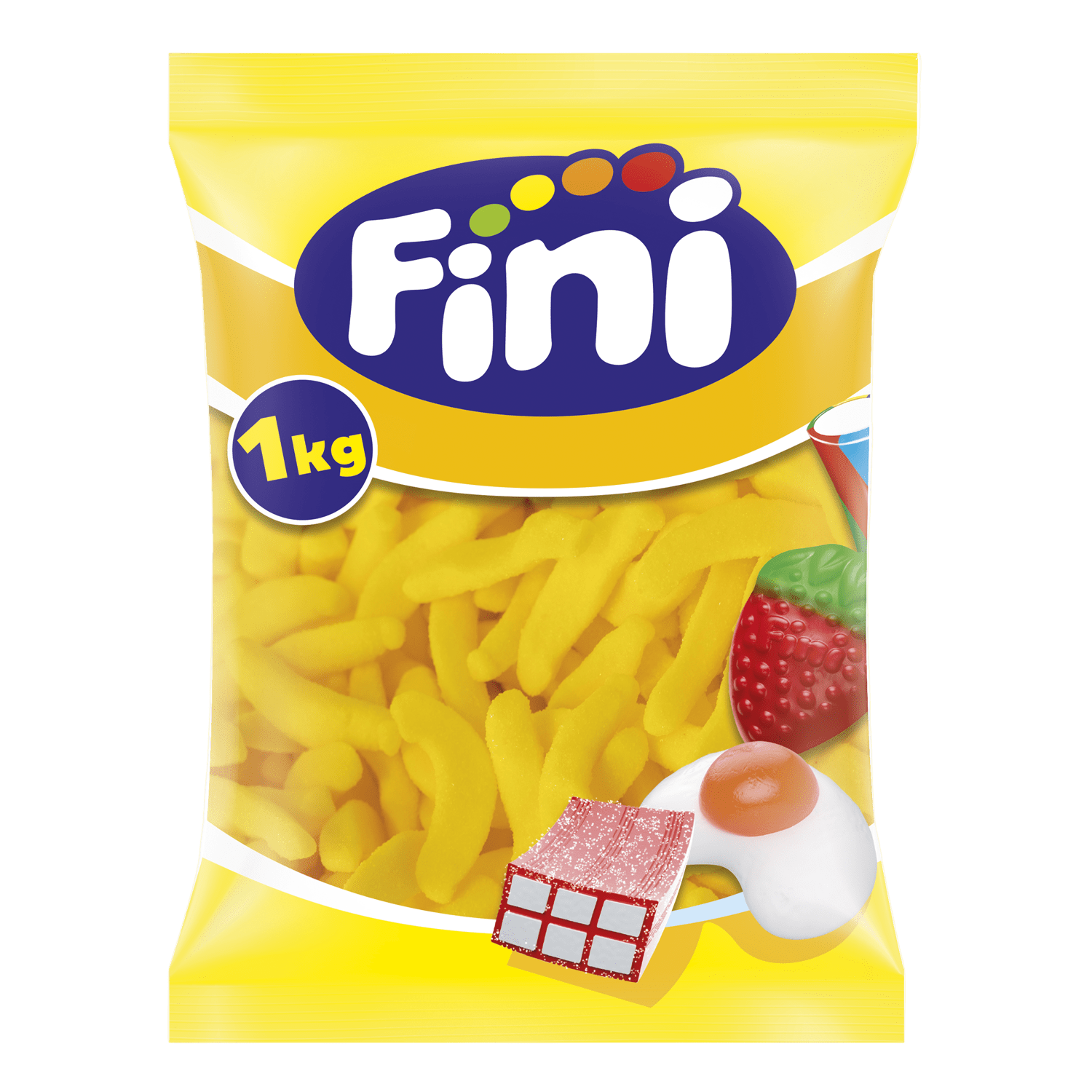 Bolsa de 1 kilo de Plátanos Fini, golosinas con forma y sabor a plátano, recubiertas de azúcar. Perfectos para dar un toque amarillo vibrante a tus tartas de chuches, montar un candy bar tropical o crear una mesa dulce.