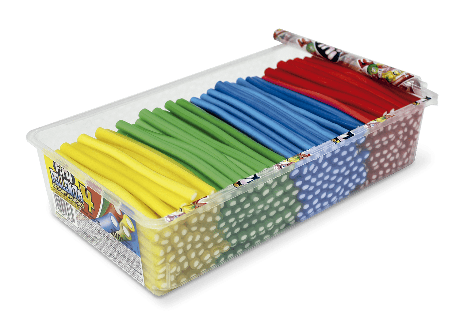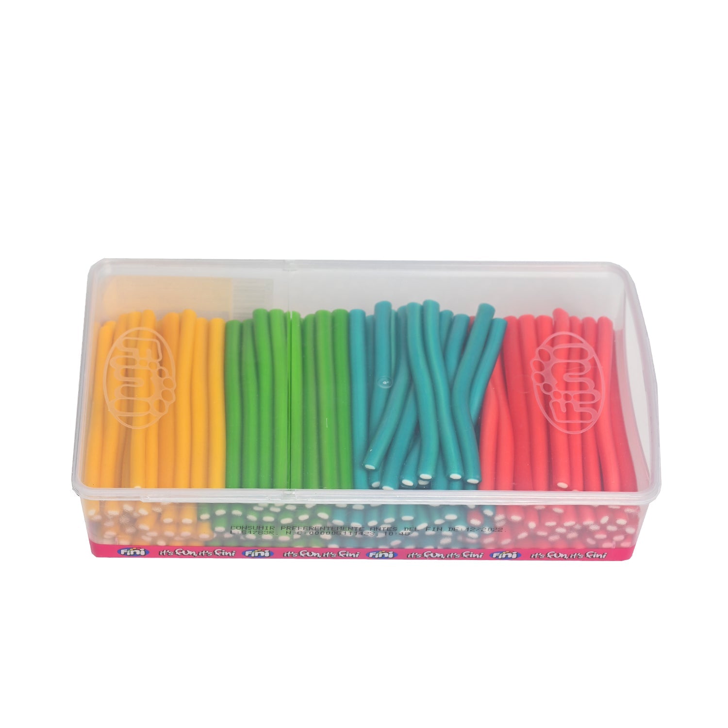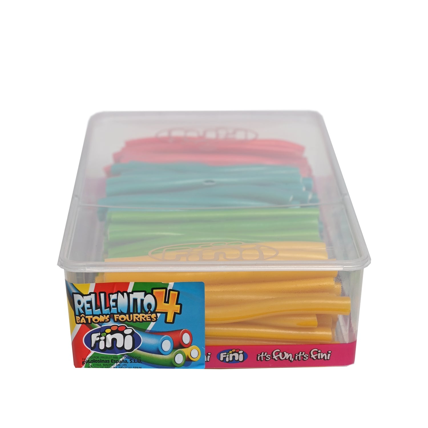 Tarro con 200 unidades de regalices Rellenitos Fini de nata, en cuatro colores: rojo, azul, amarillo y verde. Ideales para candy bar, cumpleaños o para decorar una mesa de chuches.