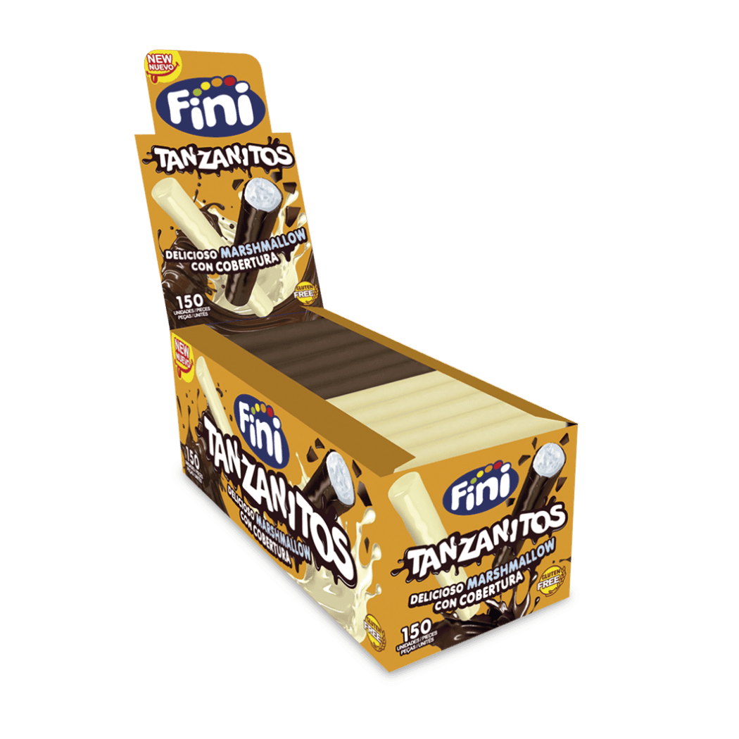 Estuche de 150 unidades de Tanzanitos con cobertura de Choco y Nata de Fini, bastones de nube con deliciosa cobertura de choco en blanco y negro. Ideales para decorar mesas dulces en bodas, comuniones o eventos, compartir con amigos o sorprender en cualquier fiesta. Debido a la cobertura, se recomienda mantenerlos en un lugar fresco, ya que son sensibles al calor.