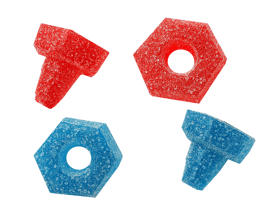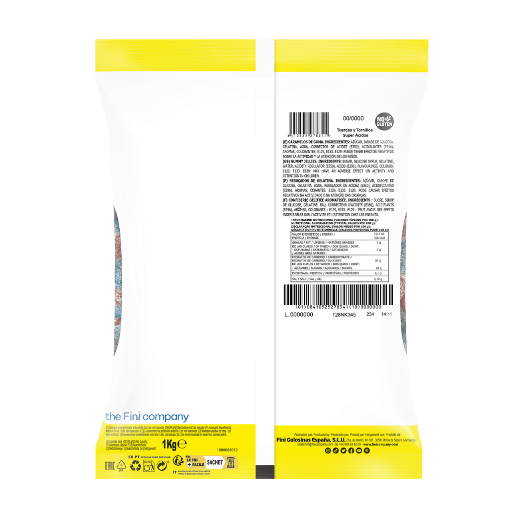 Bolsa de 1 kilo de Tuercas y Tornillos Súper Ácidas Fini, golosinas en forma de tuercas y tornillos, con sabor a fresa y frambuesa y recubiertas de azúcar súper ácida. Con efecto pintalenguas para una experiencia doblemente divertida. Perfectas para cumpleaños, fiestas temáticas o cualquier evento.
